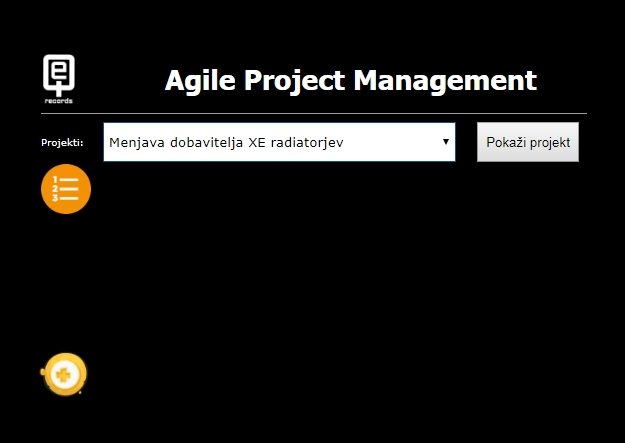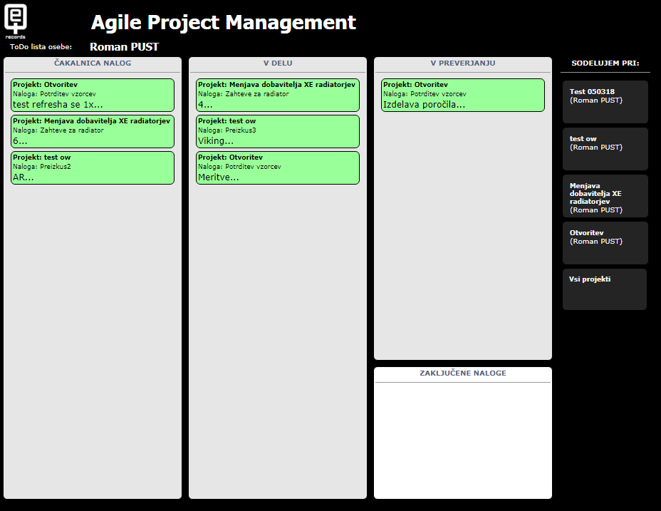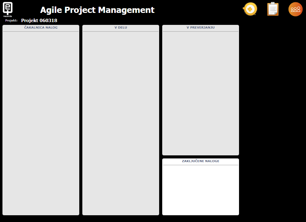 S klikom na POKAŽI PROJEKT se prikaže urejevalnik projekta, kjer so prikazana polja ČAKALNICA NALOG, V DELU, V PREVERJANJU in ZAKLJUČENE NALOGE.