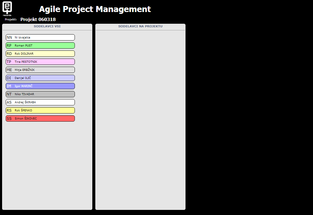 Za dodeljevanje odgovornih oseb / izvajalcev k posamezni aktivnosti, potrebujemo še nabor oseb, ki bodo sodelovale na projektu. Klik na ikono s tremi figurami in odpre se urejevalnik za imenovanje ekipe na projektu. Ekipo lahko gradimo tudi sproti. Ekipo sestavimo s preprosim vlečenjem polja z imeonm osebe iz polja SODELAVCI VSI v polje SODELAVCI NA PROJEKTU. |