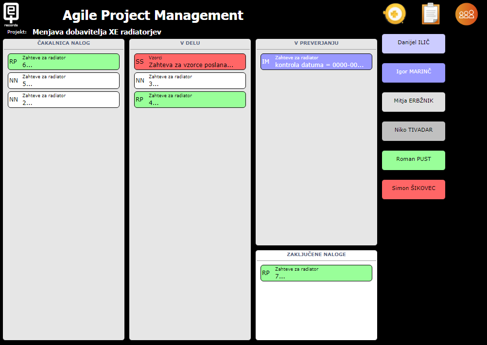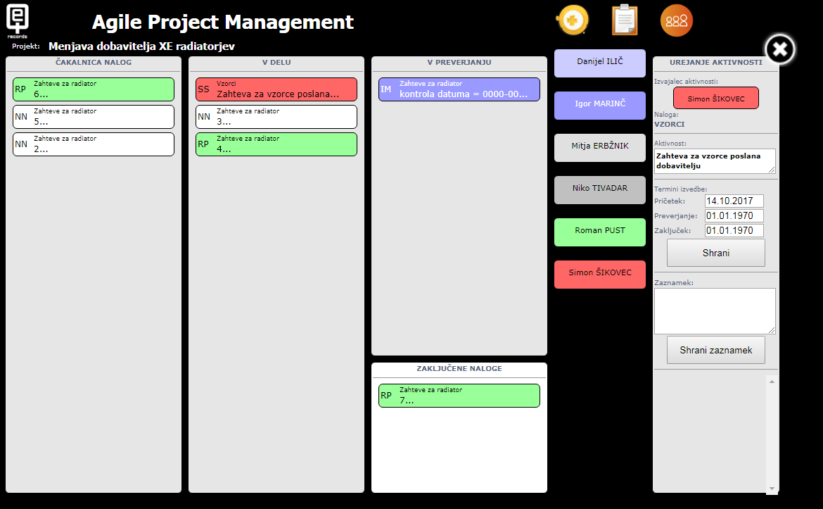 Tako imamo sedaj na voljo že vpisane naloge in aktivnosti na projektu, ter odgovorne osebe, ki bodo dodeljene posamezni aktivnosti. Vsaka oseba ima svojo lastno barvo za lažje ločevanje in prepoznavanje. Vse nove aktivnosti se pojavijo v polju ČAKALNICA NALOG. Če želimo določeno aktivnost preseliti v polje V DELU, potem jo preprosto potegnemo v sosednje polje. Enako storimo, če želimo dati aktivnost v pregled ali jo zaključiti. |