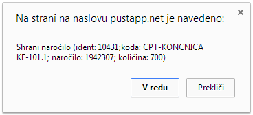 Zaradi varnosti in možnosti zaustavitve procesa prenosa podatkov v bazo aplikacije se za vsako vrstico posebej prikaže obvestilo, kjer lahko postopek prenosa prekinemo. Če se s prenosom strinjamo samo potrebnokrat pritisnemo na gumb V REDU. | |