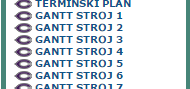 Preračun, katerega sprožimo s pritiskom na TERMINSKI PLAN v levem meniju, zgradi terminski plan posameznega stroja. Za vsak stroj tako obstaja GANTT DIAGRAM. | |