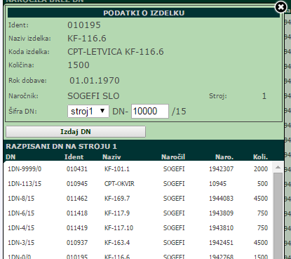 | Naknadno spremenjen rok dobave je evidentiran tako, da se v pregledu PODATKI O IZDELKU poleg roka dobave izpiše še opomba ""* SPREMEMBA * . | |
