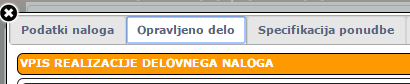 Vpis realizacije lahko opravimo neposredno na nalogu ali pa preko kartoteke izvajalca. Najprej je prikazan vpis realizacije preko naloga. Odpremo zavihek OPRAVLJENO DELO. |