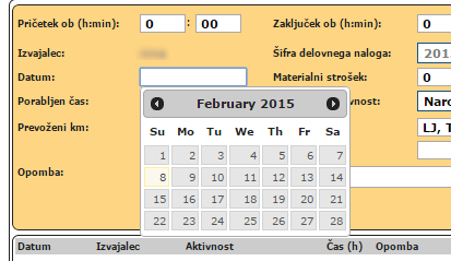 Kliknemo na vnosno polje DATUM in odpre se koledarček, s pomočjo katerega izberemo željeni datum pričetka aktivnosti. | |