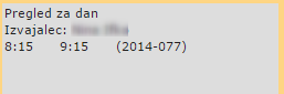 Vpišemo še ostale podatke in SHRANIMO. Za izbrani dan se prikaže pregled aktivnosti, ki so opredeljene s časom trajanja in šifro pripadajočega naloga. | |